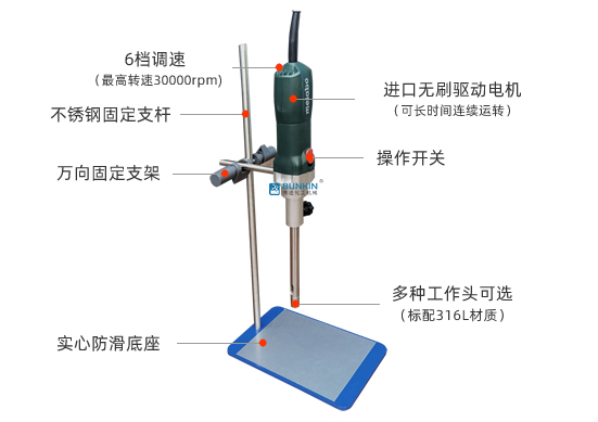 實(shí)驗(yàn)室高速乳化機(jī)集靈巧、方便于一身。可手持操作。選用德國原裝無刷大功率馬達(dá),無刷電機(jī),運(yùn)行更穩(wěn)定,噪聲更小,可處理更大范圍粘度物料。轉(zhuǎn)速可達(dá)28000rpm,可長時(shí)間連續(xù)運(yùn)轉(zhuǎn),多種工作頭可供選擇,輕松滿足多種高要求分散、乳化、均質(zhì)的實(shí)驗(yàn)要求 。