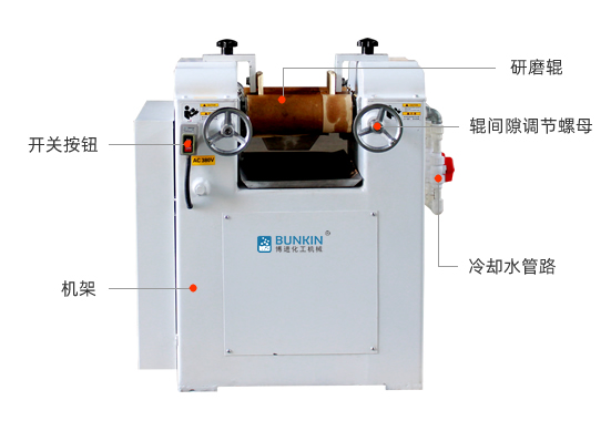三輥研磨機由三個輥筒組成,裝在一個機架上,由電動機直接帶動。一般輥筒間的轉動方向不同,前輥向前轉動,中輥向后轉動。輥子轉速前輥快、后輥慢。中間輥固定,前后兩輥裝在滑道上,有彈簧裝置,用手輪調節前后輥與中輥的距離。物料由后輥與中輥之間進入,受到輥筒的擠壓,產品顆粒變細,然后由快輥帶出,快輥末端裝有刮刀,使物料與輥筒分離,落入收集桶內。