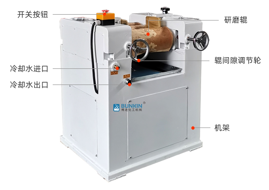 三輥研磨機由三個輥筒組成,裝在一個機架上,由電動機直接帶動。一般輥筒間的轉動方向不同,前輥向前轉動,中輥向后轉動。輥子轉速前輥快、后輥慢。中間輥固定,前后兩輥裝在滑道上,有彈簧裝置,用手輪調節(jié)前后輥與中輥的距離。物料由后輥與中輥之間進入,受到輥筒的擠壓,產品顆粒變細,然后由快輥帶出,快輥末端裝有刮刀,使物料與輥筒分離,落入收集桶內。