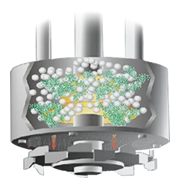 籃式研磨機工作時由電機運轉帶動撥桿和底部分散盤高速旋轉,使分散盤上部及籃腔內部形成真空,漿料被吸入籃式研磨腔內。撥桿驅動腔內的研磨介質產生向各個方向的力,物料中的顆粒受到介質不斷地碰撞及摩擦,粒徑變小,粒徑范圍變窄;分散盤的高速運轉,產生渦流將腔內物料抽吸出來,再循環至進料,具有非常顯著的分散研磨混合效果。