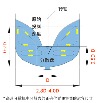 分散機(jī)的鋸齒狀圓形分散盤在容器內(nèi)高速分散完成固液分散、濕潤、解聚、穩(wěn)定過程。使?jié){液呈滾動(dòng)環(huán)狀流,產(chǎn)生強(qiáng)旋渦,漿液表面粒子呈螺旋狀下降到渦流底部;在分散盤邊緣2.5-5mm處形成湍流區(qū),漿料及粒子受到強(qiáng)烈剪切及沖擊;區(qū)域外形成上下兩個(gè)束流,漿料得到充分循環(huán)及翻動(dòng);分散機(jī)的分散盤下方呈層流狀態(tài),不同流速的漿料層互相擴(kuò)散,起到分散作用。