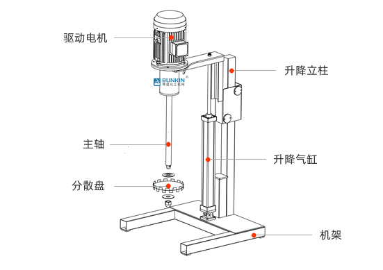 設備通過氣缸作為升降執行器,帶氣動控制閥控制分散機上升、停止、下降,耗氣量低,操作簡單;分散盤采用內六角螺栓與主軸固定,能夠方便快速拆卸更換,清洗容易;帶有手動夾桶裝置,可以快速將攪拌桶固定,防止桶在工作中發生位移造成安全事故;