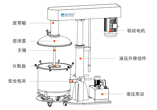 設備通過油缸作為升降執行器,帶控制閥控制分散機上升、停止、下降,操作簡單,穩定性高;分散盤采用內六角螺栓與主軸固定,能夠方便快速拆卸更換,清洗容易,且可以根據工藝情況更換不同的分散盤,實現分散效果;帶有不同的抱夾方式(皮帶、手搖、氣動),可以快速將攪拌桶固定,防止桶在工作中發生位移造成安全事故。
