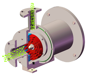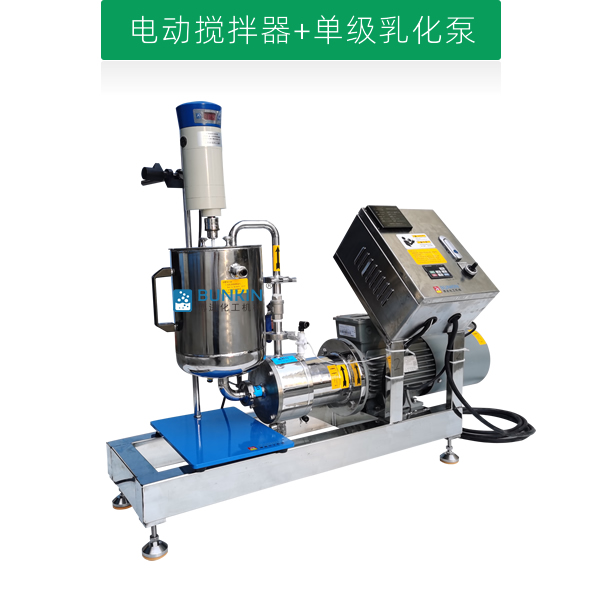 單級高剪切乳化泵采用臥式結構。在狹長的工作腔內裝有一組轉定子,轉定子可設計成單級兩層或者單級六層結構,轉定子對偶耦合。由電機帶動中間軸進行高速運轉,轉定子形成真空,物料從進口被吸入轉定子腔內,強大動能使轉子產生極高的線速度,使物料在轉、定子間隙之間經過強烈的撞擊、破碎、離心擠、液層摩擦、強力剪切之后飛射出去,在多種不同方向力的作用下,產生強大紊流,物料從出口流出。并可根據工藝要求進行多次循環處理。