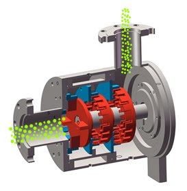 高剪切乳化泵采用臥式結(jié)構(gòu)。在狹長(zhǎng)的工作腔內(nèi)裝有一組或多組轉(zhuǎn)定子,轉(zhuǎn)定子對(duì)偶耦合。由電機(jī)帶動(dòng)中間軸進(jìn)行高速運(yùn)轉(zhuǎn),轉(zhuǎn)定子形成真空,物料從進(jìn)口被吸入轉(zhuǎn)定子腔內(nèi),強(qiáng)大動(dòng)能使轉(zhuǎn)子產(chǎn)生極高的線速度,使物料在轉(zhuǎn)、定子間隙之間經(jīng)過(guò)強(qiáng)烈的撞擊、破碎、離心擠、液層摩擦、強(qiáng)力剪切之后飛射出去,在多種不同方向力的作用下,產(chǎn)生強(qiáng)大紊流,物料從出口流出。并可根據(jù)工藝要求進(jìn)行多次循環(huán)處理。