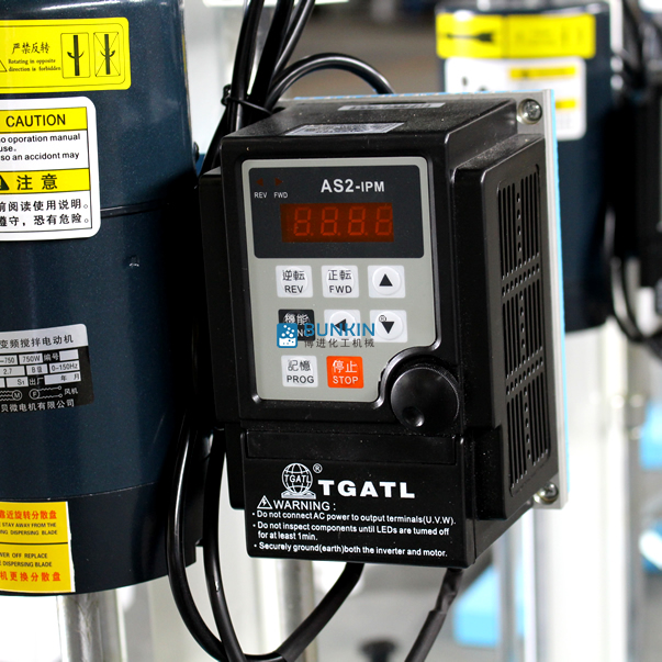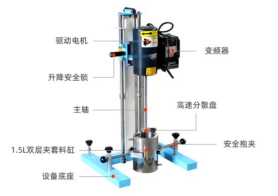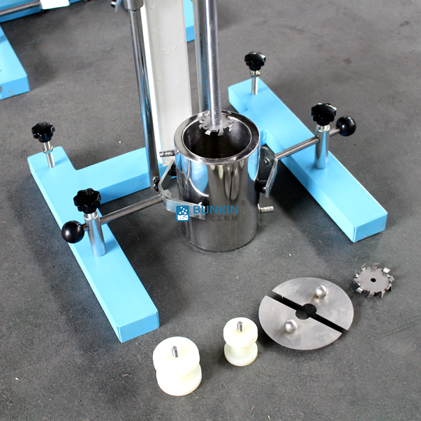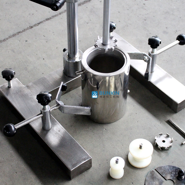 設備帶有鎖緊及升降手柄,能夠快速升降和固定;分散盤采用內六角螺栓與主軸固定,能夠方便快速拆卸更換,清洗容易;帶有夾桶裝置,可以快速將攪拌桶固定,防止桶在工作中發生位移造成安全事故。